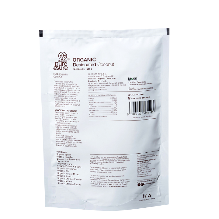 Processed with care and hygiene from the finest quality of organic coconuts, our desiccated coconut is flaked and dried to perfection, and retains the natural taste of fresh coconuts. Makes for an easy topping on sweet or savoury dishes. Add it to desserts, smoothie bowls or Asian curries for a kick of flavour and extra nutrition.