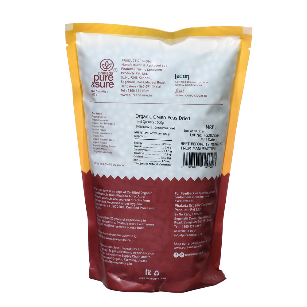 Our organic dried green peas are handpicked and vacuum-packed so that you can enjoy their natural goodness for up to 12 months. Use them in soups, curries, and stews by cooking them down into a thick & creamy texture and add a satisfying body to any dish. They also provide a handsome source of dietary fiber, minerals, proteins, and vitamins.
