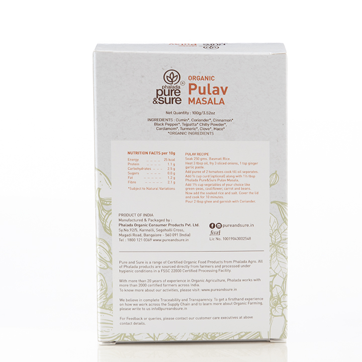 Unleash the chef within you with our Organic Pulav Masala and bring out the real flavour in whatever Pulav you choose to make. Add it to your carts and kitchens and get ready to experience a true delight for taste buds with every serving.