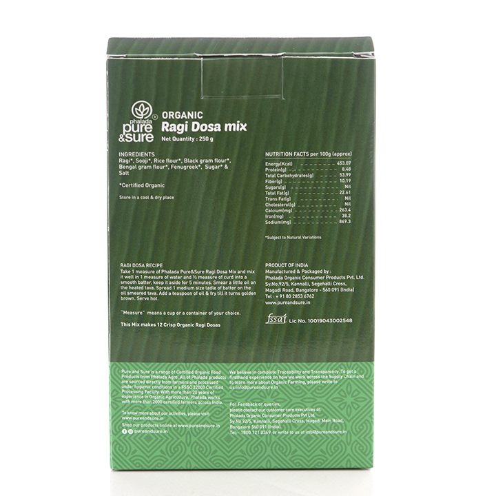 Made from the finest quality ingredients sourced from certified organic farms across India, Phalada Pure and Sure Organic Ragi Dosa Mix bring you the magic of traditional dosas with the goodness of calcium-rich Ragi.