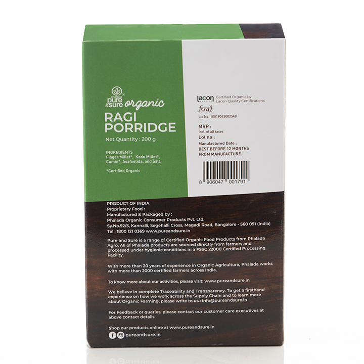 ORGANIC PORRIDGE MIX: 100% Certified Organic Ragi Porridge made from the finest quality ingredients sourced from certified organic farms across India. Perfect as baby porridge or porridge for adults.