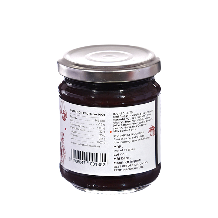 NUTRITION ON THE GO: Made from natural ingredients, our red fruit jam is rich in sodium, and has very little cholesterol. It contains vital nutrients, including dietary fiber, vitamin C, folate (folic acid), and potassium. Fruit jams are one of the healthiest organic bread spreads for weight watchers and fitness enthusiasts.