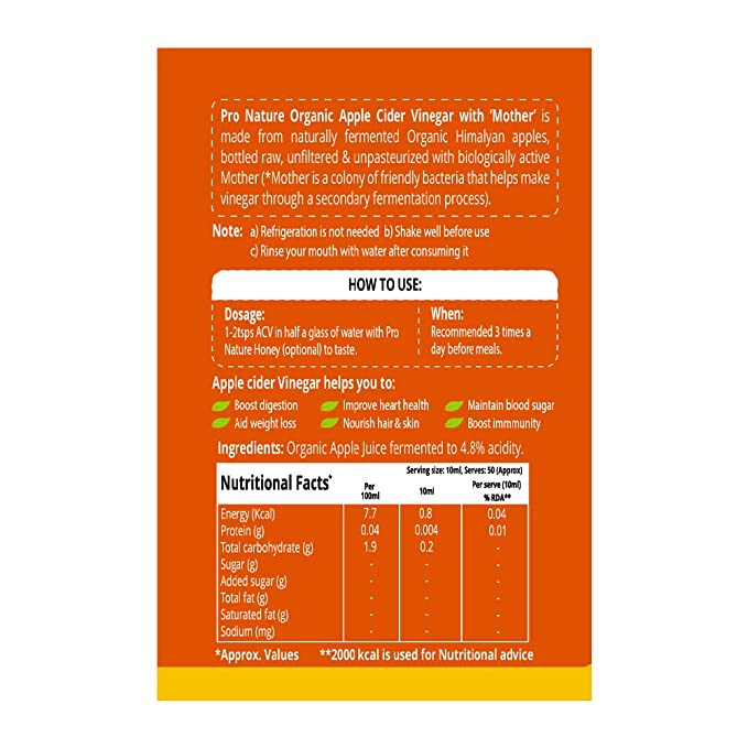 Pro Nature 100% Certified Organic Apple Cider Vinegar is made from naturally fermented, organically grown Himalayan apples and bottled raw, unfiltered and unpasteurized with the biologically active Mother. Wondering what Mother is? Mother is a colony of friendly bacteria that helps make vinegar through a secondary fermentation process. Pro Nature Organic Apple Cider Vinegar is naturally rich in vitamins and minerals to offer multiple health, hair & skin benefits. Whether as a tangy salad dressing swap-in, quick digestive tonic, use Pro Nature Apple Cider Vinegar in moderation, and pair it with a nutritious diet and healthy lifestyle to maximize your results.