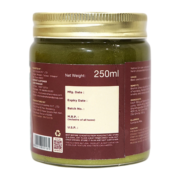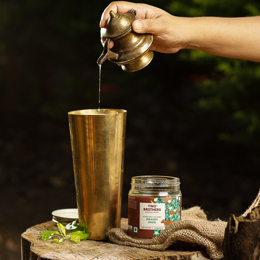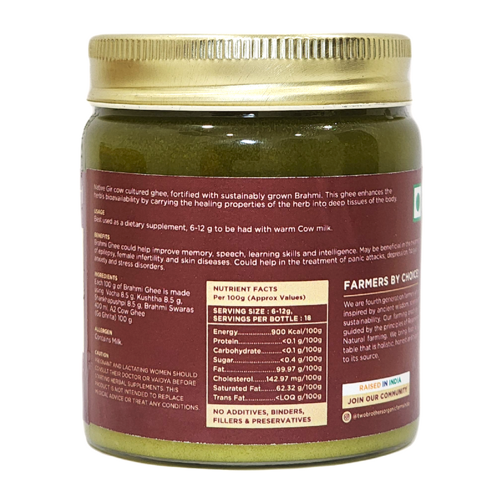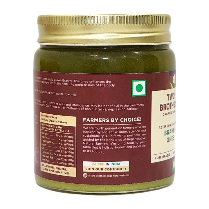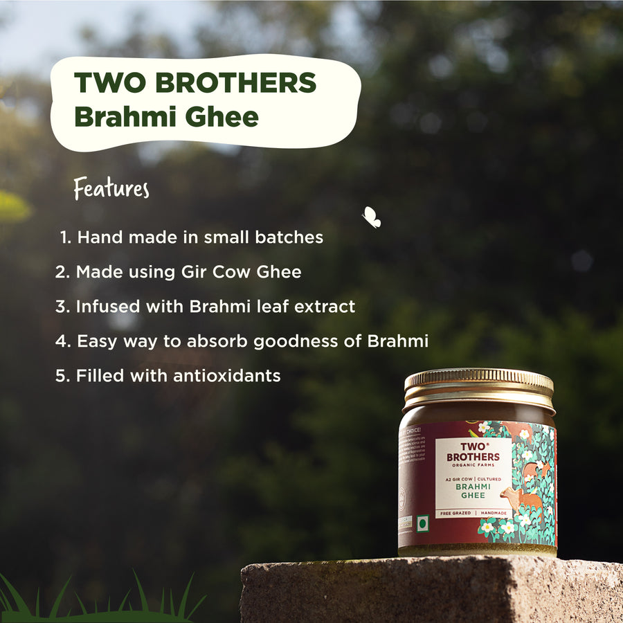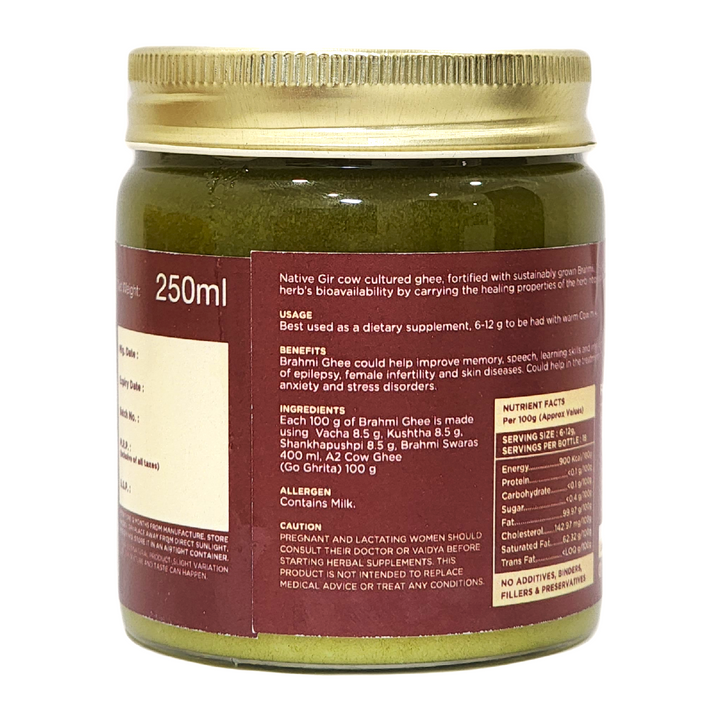 Ghee is clarified butter which is slow cooked over a fire which allows the fat solids to separate. The liquid part is skimmed off and poured into sterile jars. It is infused with Brahmi leaf extract which act as an aromatic as well as adds natural antioxidants to the ghee.