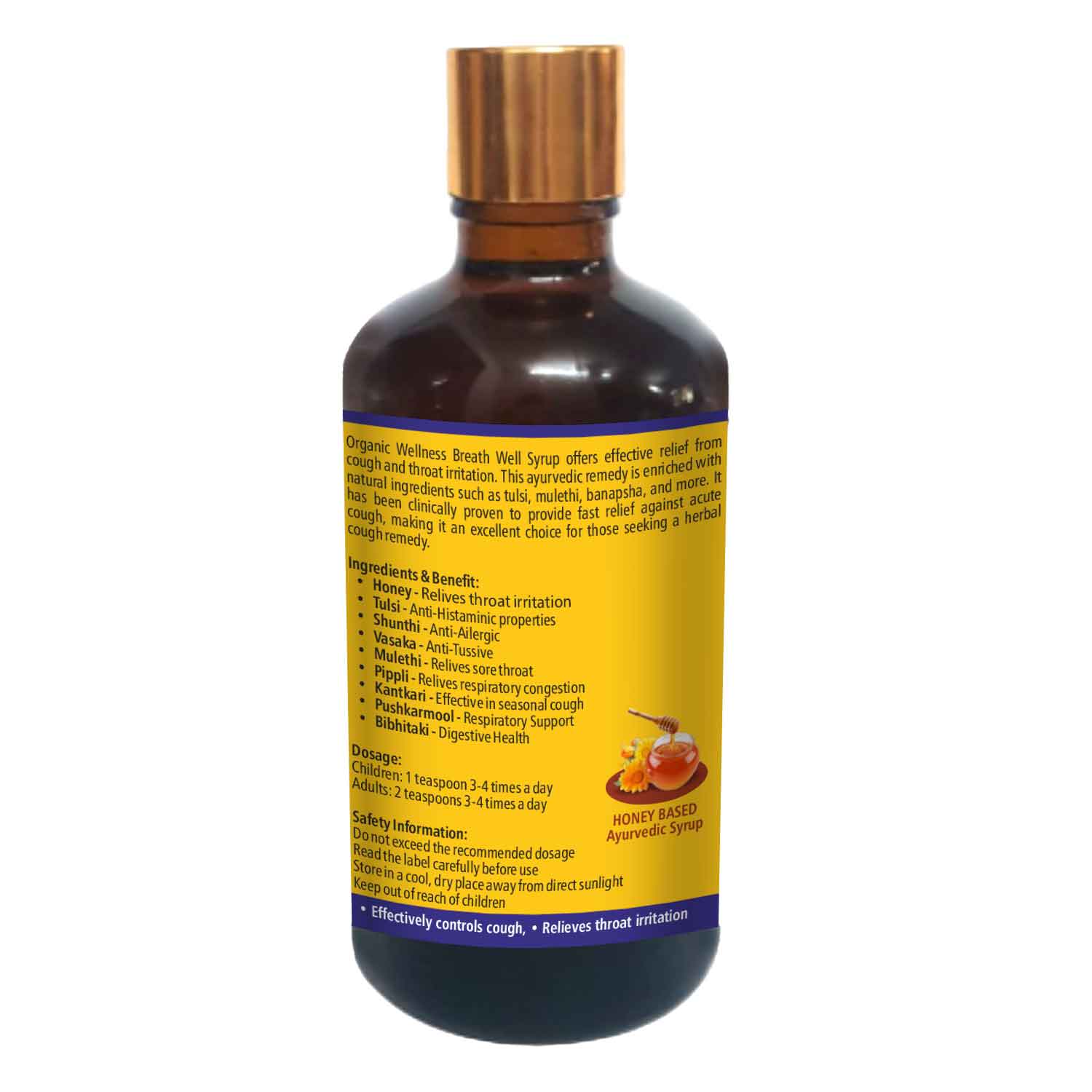 Organic Wellness Breath Well Syrup offers effective relief from cough and throat irritation. This ayurvedic remedy is enriched with natural ingredients such as tulsi, mulethi, banapsha, and more. It has been clinically proven to provide fast relief against acute cough, making it an excellent choice for those seeking a herbal cough remedy.