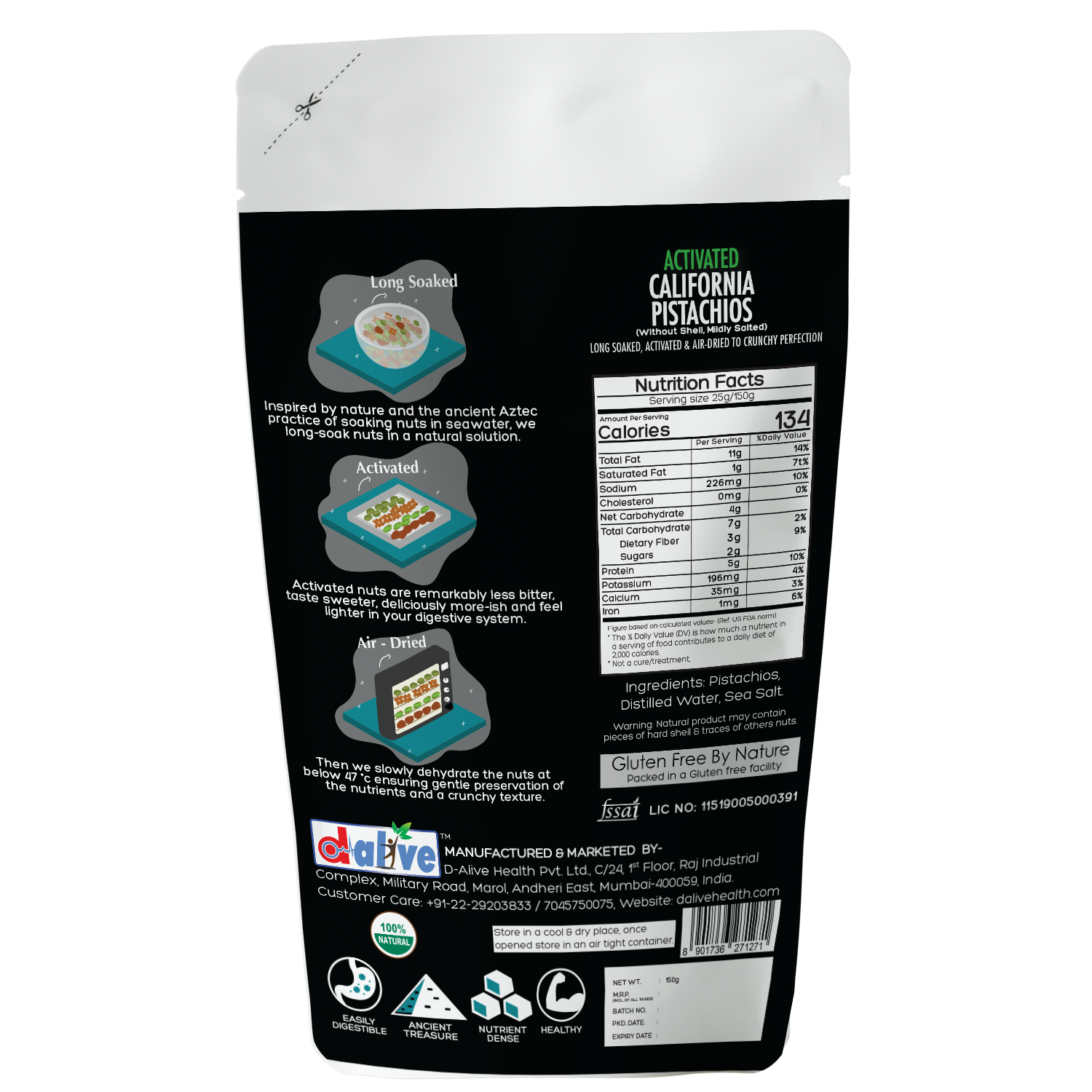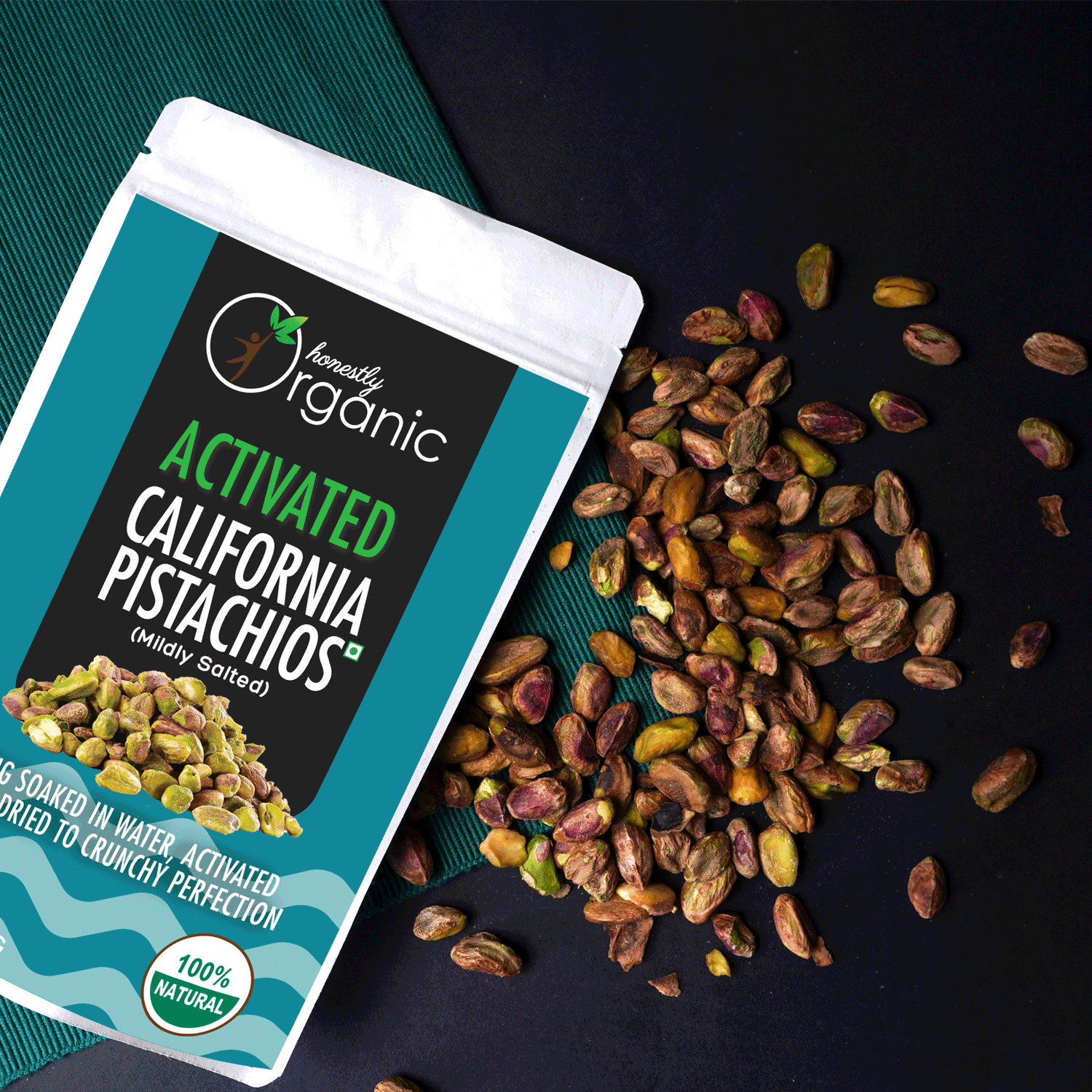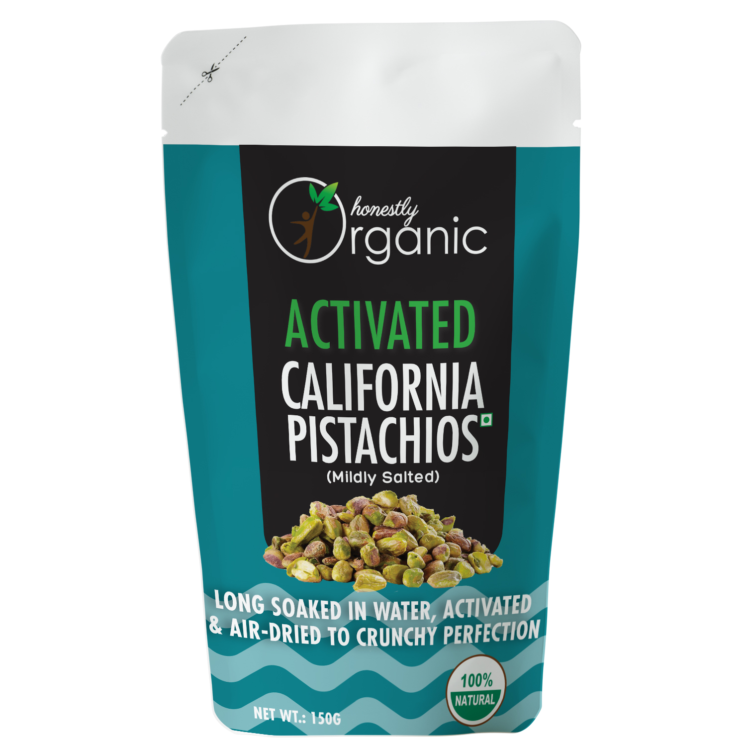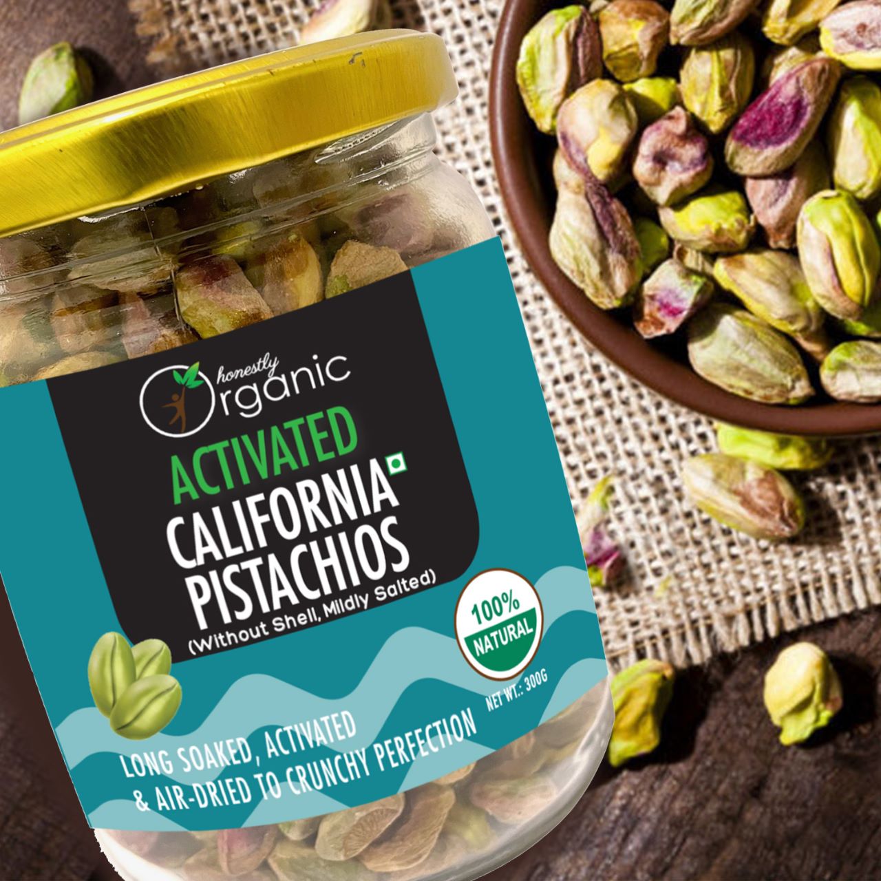 Activated Pistachios are effectively fermented, germinated or sprouted nuts. In nature nuts experience being soaked in rainwater which triggers their germination process. The dormant nuts awakens with enough power to create a whole tree! Nature’s defence mechanism for nuts and grains includes nutritional inhibitors and toxic substances (found for example as the bitter aftertaste of walnuts) that can be naturally removed by soaking. These toxic substances include enzyme inhibitors, phytates (phytic acid), polyphenols (tannins) and goitrogens. Soaking nuts in warm water will neutralize these enzyme inhibitors and also encourage the production of beneficial enzymes. In turn these enzymes can increase vitamins, especially B vitamins. Inspired by nature and the ancient Aztec practice of soaking nuts in seawater, we long-soak nuts in a natural solution. Then we slowly dehydrate the nuts at below 47 °c ensuring gentle preservation of the nutrients and a crunchy texture. Activated nuts are remarkably less bitter, taste sweeter, deliciously more-ish and feel lighter in your digestive system.