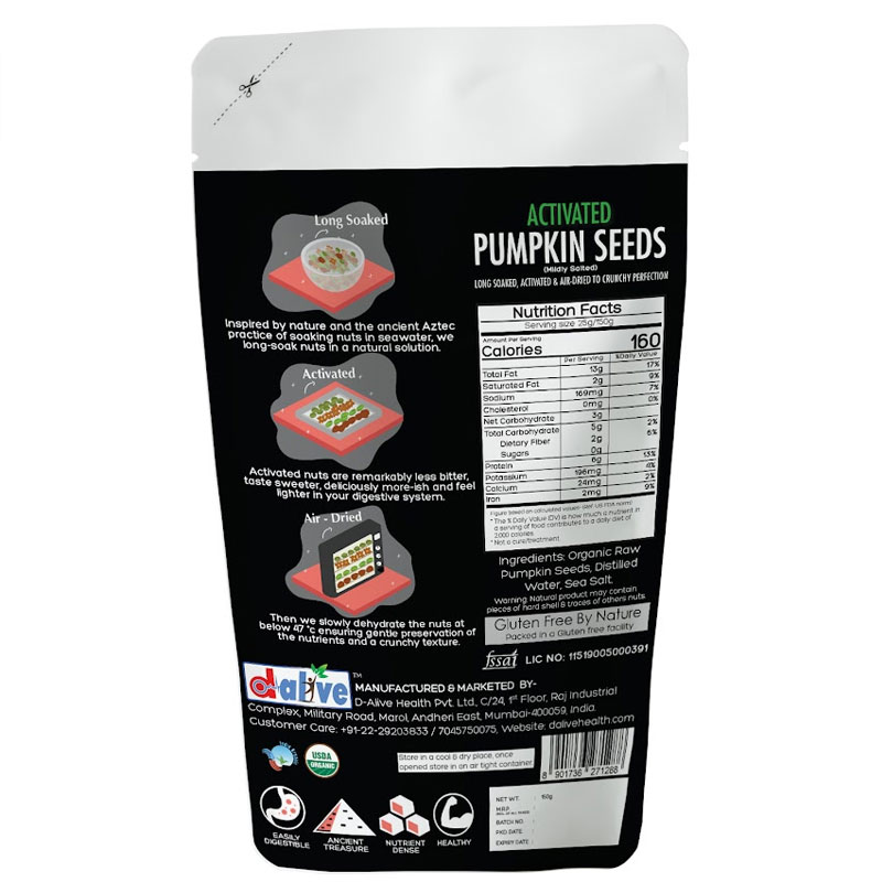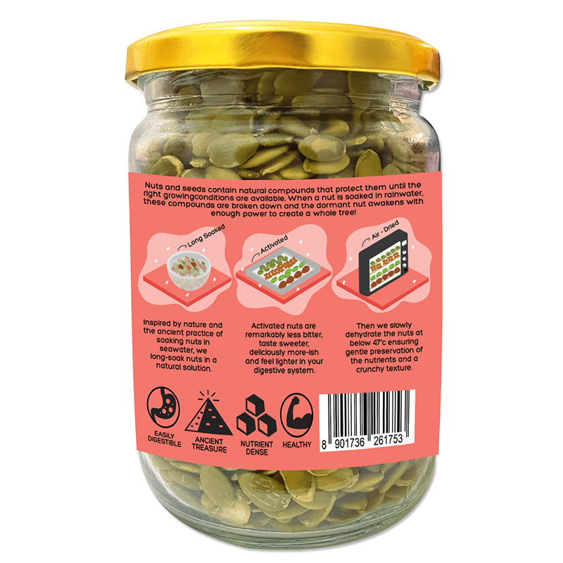 Pumpkin seeds contain a diverse range of minerals including zinc, potassium, magnesium, and calcium. We source the best, truly raw, organic pumpkin seeds, which we long-soak in a saline solution of filtered water and Mountain Spring Salt. This activation process minimizes or eliminates enzyme inhibitors, phytates (phytic acid), polyphenols (tannins), and goitrogens (all of which were added by Mother Nature to prevent the precious seeds being eaten and digested). Our gentle drying process (at temperatures below 47ºC) ensures the seeds remain in their nutritious, raw state.