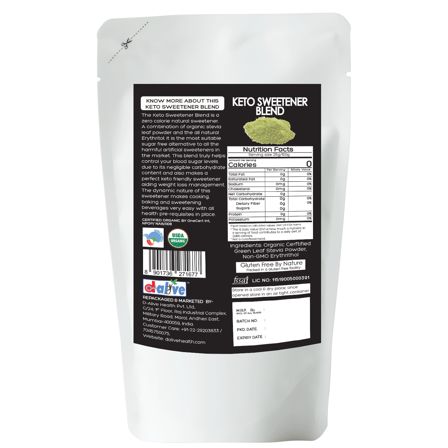 The Keto Sweetener Blend is a zero calorie natural sweetener. A combination of organic stevia leaf powder and the all natural Erythritol. It is the most suitable sugar free alternative to all the harmful artificial sweeteners in the market. This blend truly helps control your blood sugar levels due to its negligible carbohydrate content and also makes a perfect keto friendly sweetener aiding weight loss management. The dynamic nature of this sweetener makes cooking, baking and sweetening beverages very easy with all health pre-requisites in place.