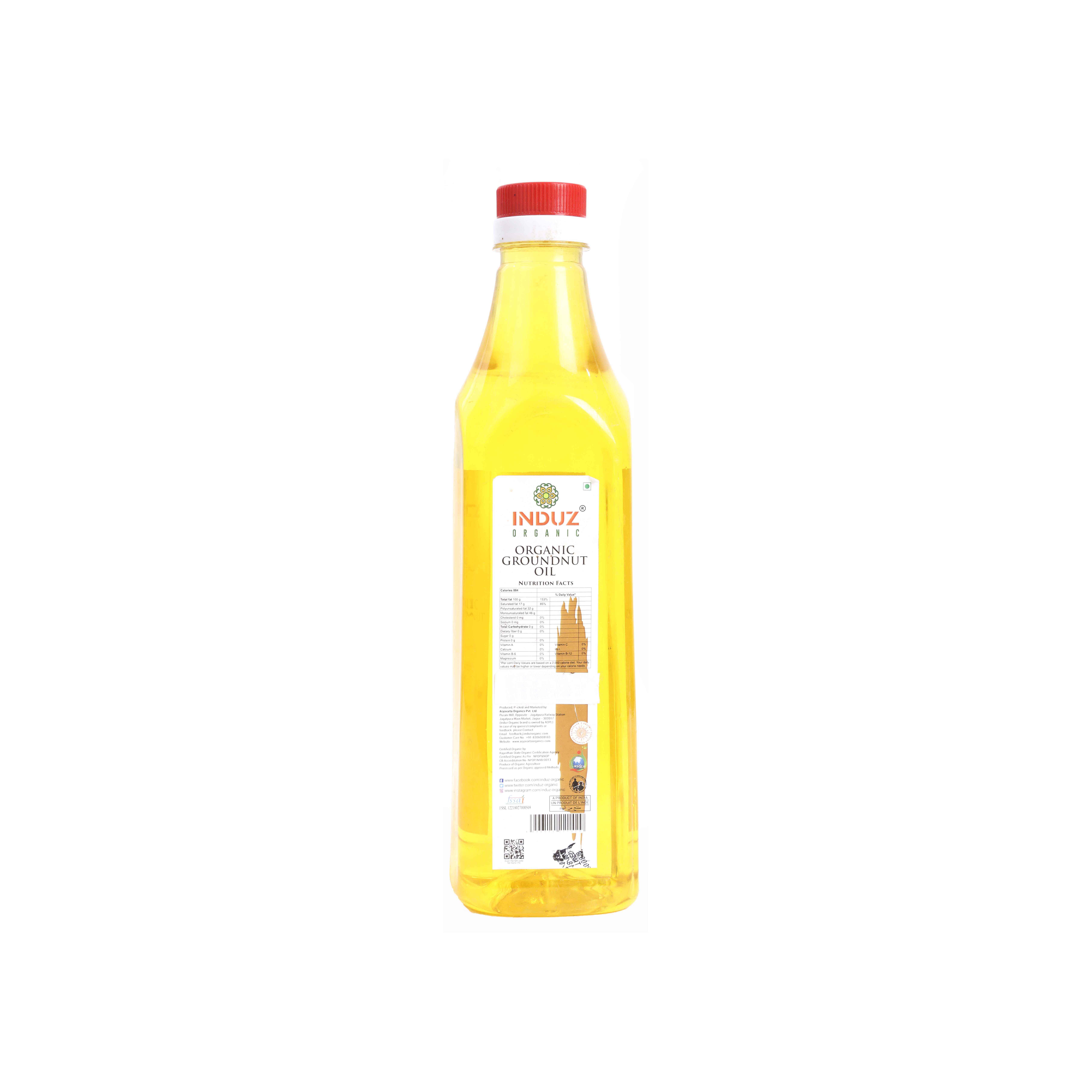Induz Organic Groundy Groundnut Oil - 1 ltr is Natural, Pure & Certified Groundy Groundnut Oil prepared by grinding Organic Groundnut Seeds. this Organic Groundnut Oil has the perfect natural color & the distinct, aroma & rich taste of pure Groundnut.Benefits : Induz Organic Groundnut oil contains phytochemicals and vitamin E, both of which are natural antioxidants. It also reduces inflammation if consumed regularly. It is said to keep many diseases like cancer at bay. The vitamin E helps maintain good skin health, making it look young and healthy.