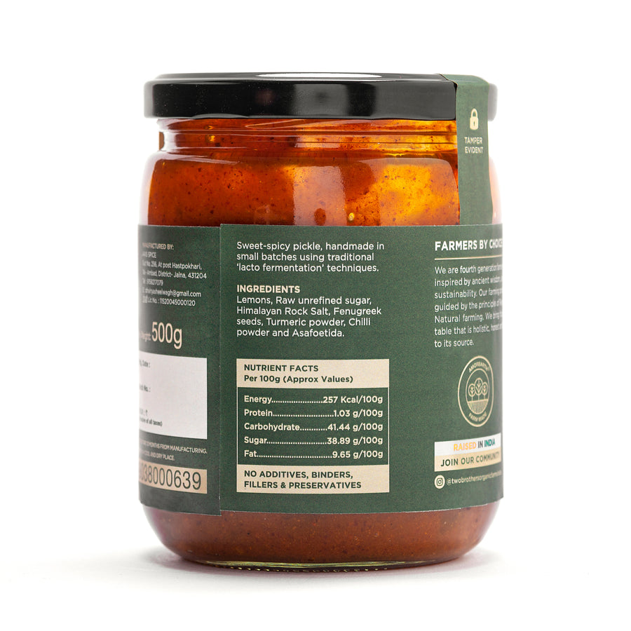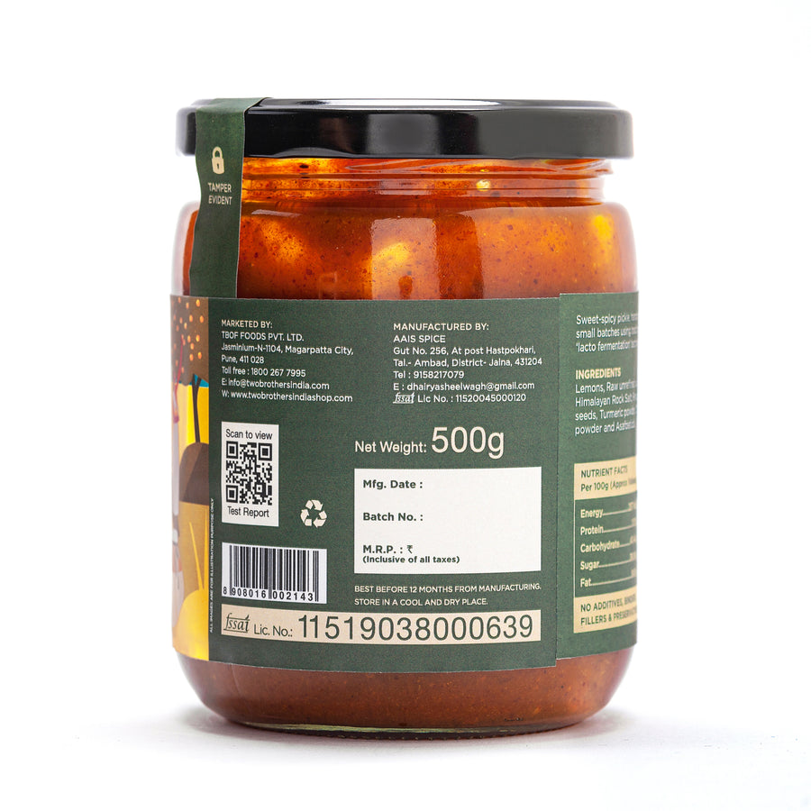 Benefits: Oil free pickle, No refined ingredients, Lacto-fermentation aids in digestion, Lemons are alkaline and maintain a good ph balance in the body, High in Vitamin C, Helps in easing nausea