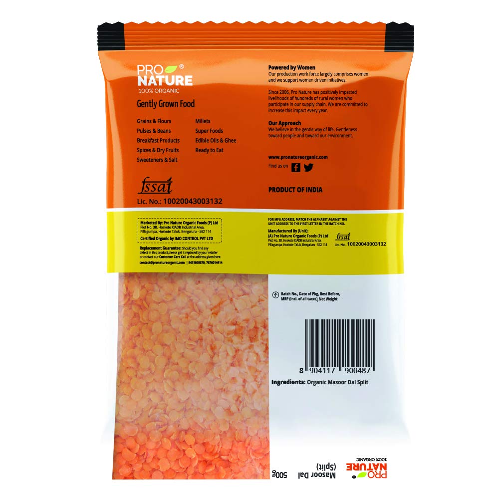 a) Pro Nature Organic Masoor Dal is sourced from certified organic farms bringing 100% organic, unpolished pulses that retain their goodness and natural taste. b) It is an important source of Proteins making it a healthy and tasty meal for everyone. c) Organically grown without pesticides and chemical fertilizers d) Masoor Dal is naturally Gluten Free.