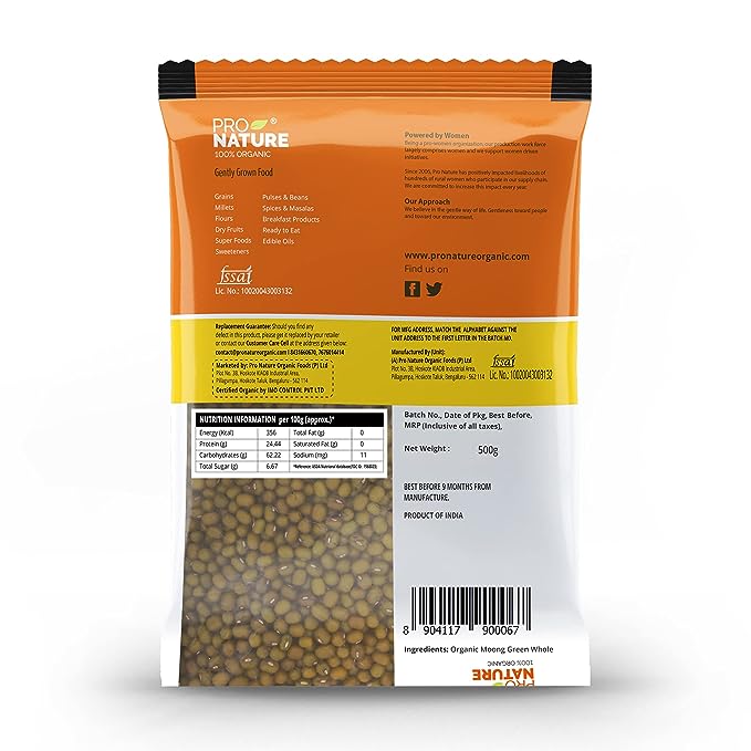 Pro Nature 100% certified Organic Moong Green Dal (Whole) is sourced from certified organic farms bringing 100% organic, unpolished pulses that retain their goodness and natural taste. It is an important source of Proteins making it a healthy and tasty meal for everyone. Organically grown without pesticides and chemical fertilizers Moong Green Whole is naturally Gluten Free. Moong green dal has a low glycemic index, therefore we can call dals diabetic-friendly!. Dals are also good source of calcium, potassium, and magnesium and alternative to animal based protein.