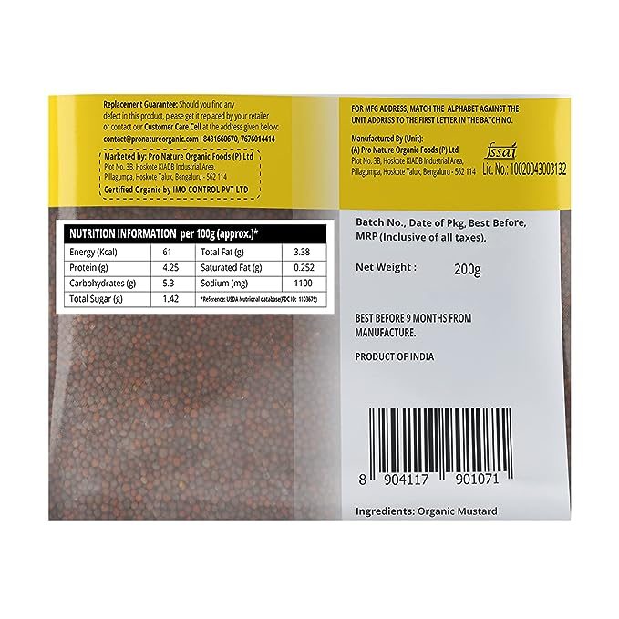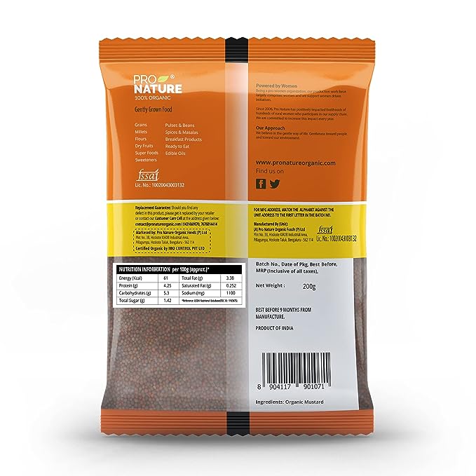Pro Nature 100% Organic Mustard Seeds has an authentic pungent flavour and strong aroma, sourced from where it is best grown. It is also called as rai, an age-old spice with culinary and medicinal uses. We take utmost care in packing and storing of all our products. Pro Nature Organic Mustard offers you a high quality spice with numerous health benefits. It is a popular ingredient in salad dressings, sauces and soups. It is also used as a table condiment. Aromatic spice adds delightful, exotic flavor to a variety of dishes and Pro Nature Organic Mustard delivers to you just that by making it available for all age groups.