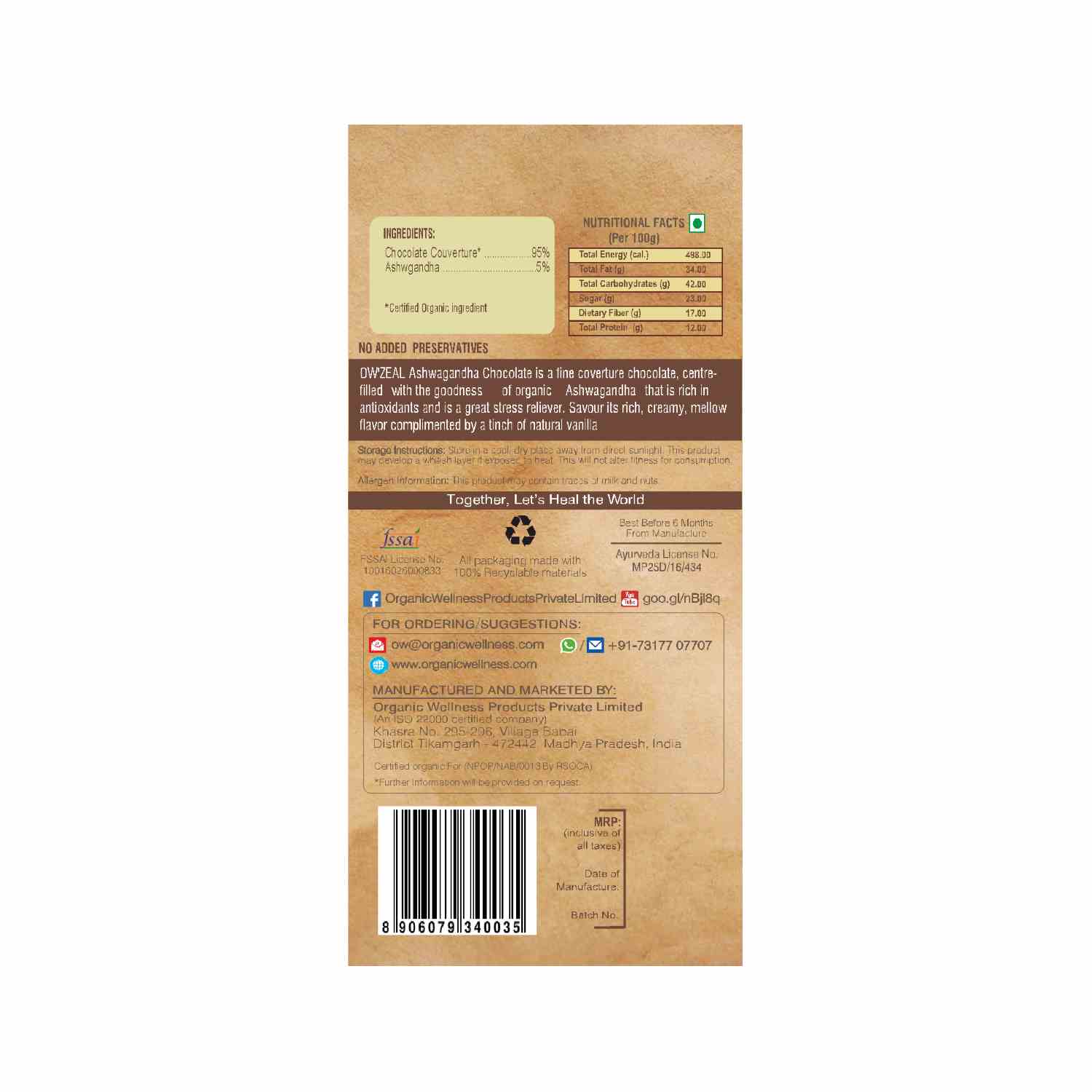 Organic wellness ashwagandha chocolate is a fine couverture chocolate, centre filled with goodness of organic ashwagandha that is rich in antioxidants and is a great stress reliever. Savour its rich, creamy, mellow flavour complimented with a pinch of vanilla.