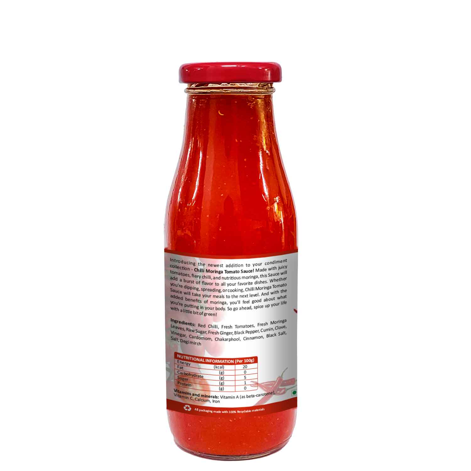 Organic Wellness Chilli Moringa Tomato Sauce is made with Fresh Tomatoes, Fresh Moringa Leaves, Red Chilli, Fresh Ginger, and an optimum balance of Cumin, Clove, Cardamom, Chakarphool, Cinnamon, Rock Salt, Black Salt, Black Pepper, Vinegar, and Sugar. No Preservatives, No Colours, No Additives, and No Emulsifiers. No Garlic or Onion either. Organic Wellness Chilli Moringa Tomato Sauce will add a delicious taste to any food, whether you are dipping or spreading. Take your meals to the next level.