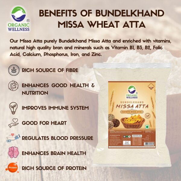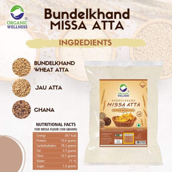 Product description Organic wellness Missa Atta a unique combination of whole wheat, gram and barley. It is a special kind of atta which consists of three grains which are whole wheat, barley and gram. These are grounded uniformly for proper mixture of these grains which results in fine flour. It has lot of health benefits and provides nutrition. About this item 100% organic whole wheat missa (atta) flour Tastes delicious and rich in fibre and carbohydrates. Grown in pollution free lands of bundelkhand. Each pack is of 5 KG Ingredients: Organic Wheat, Chana, Jau