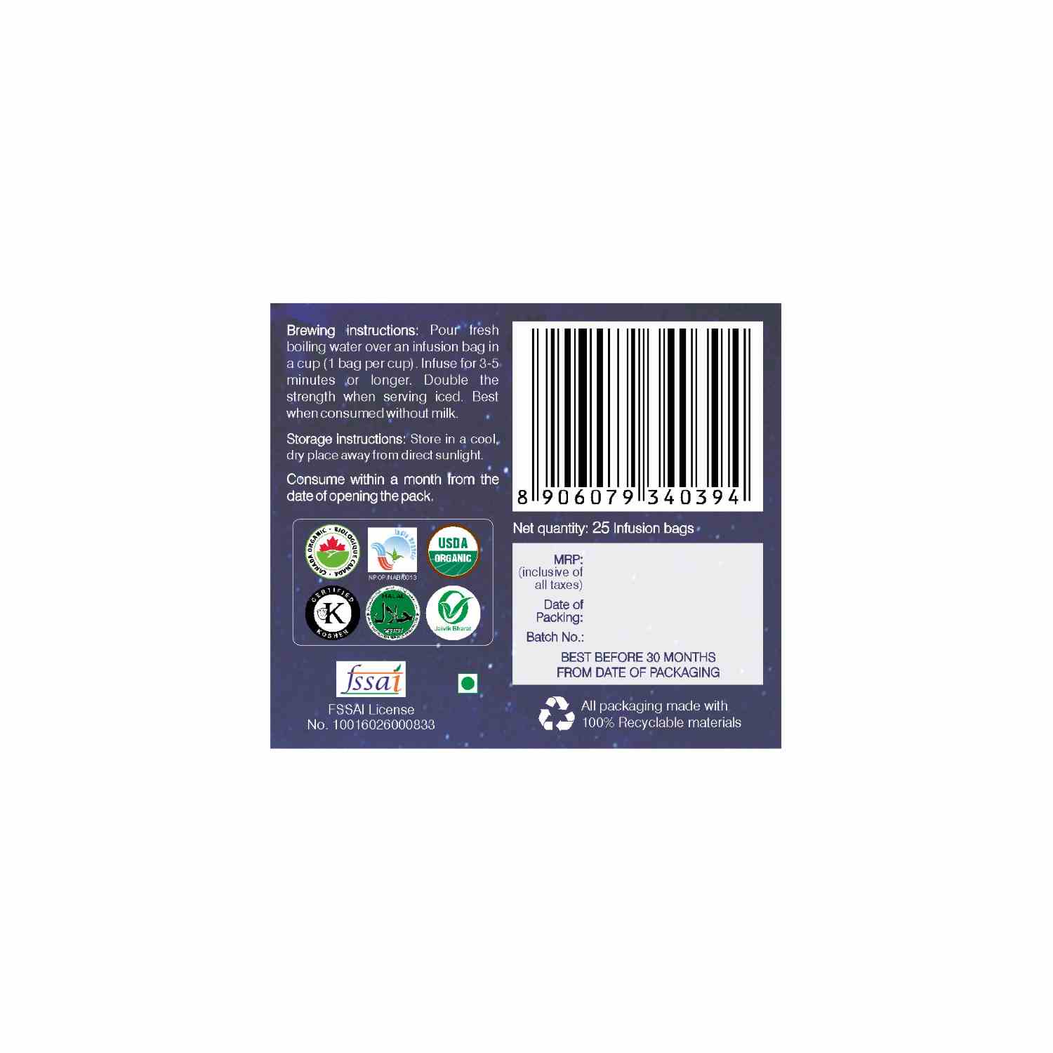 Organic Wellness Om Shanti is a soothing blend of Tulsi, Cardamom, Peppermint, Chamomile, Shankhpushpi, Ashwagandha & Brahmi. Antioxidant-rich Tulsi is a great stress reliever and strengthens the immune system. Chamomile calms the nervous system and is effective in insomnia. Ashwagandha promotes natural relaxation. Brahmi has sedative properties and soothes the mind for peaceful sleep.
