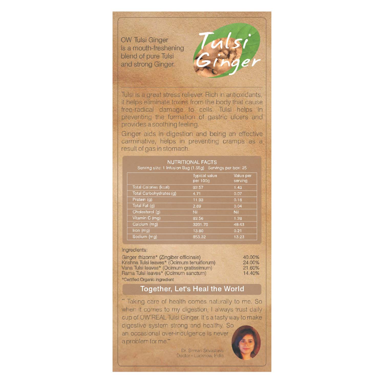 Our OW Tulsi Ginger is crafted with certified organic ingredients, including Ginger rhizome, Krishna Tulsi leaves, Vana Tulsi leaves, and Rama Tulsi leaves. With no additives or artificial components, you experience the pure essence of nature’s wellness.