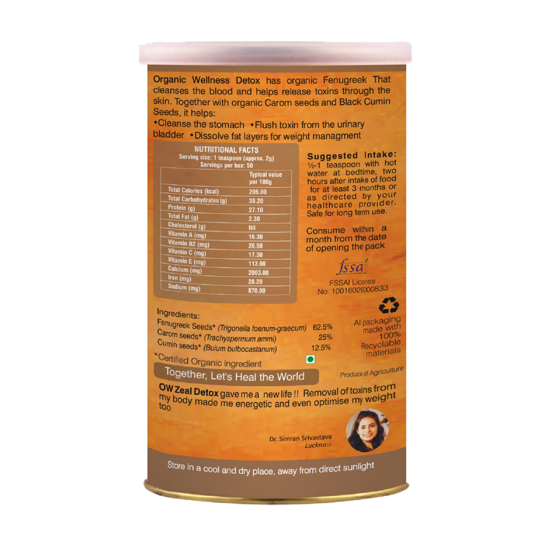 Organic Wellness Detox has organic fenugreek that helps to clean the blood and helps release toxins through the skin. With organic Carom seeds and Black Cumin seeds.Helps to clean the stomach, Helps to flush out toxins & Helps to dissolve fat layers