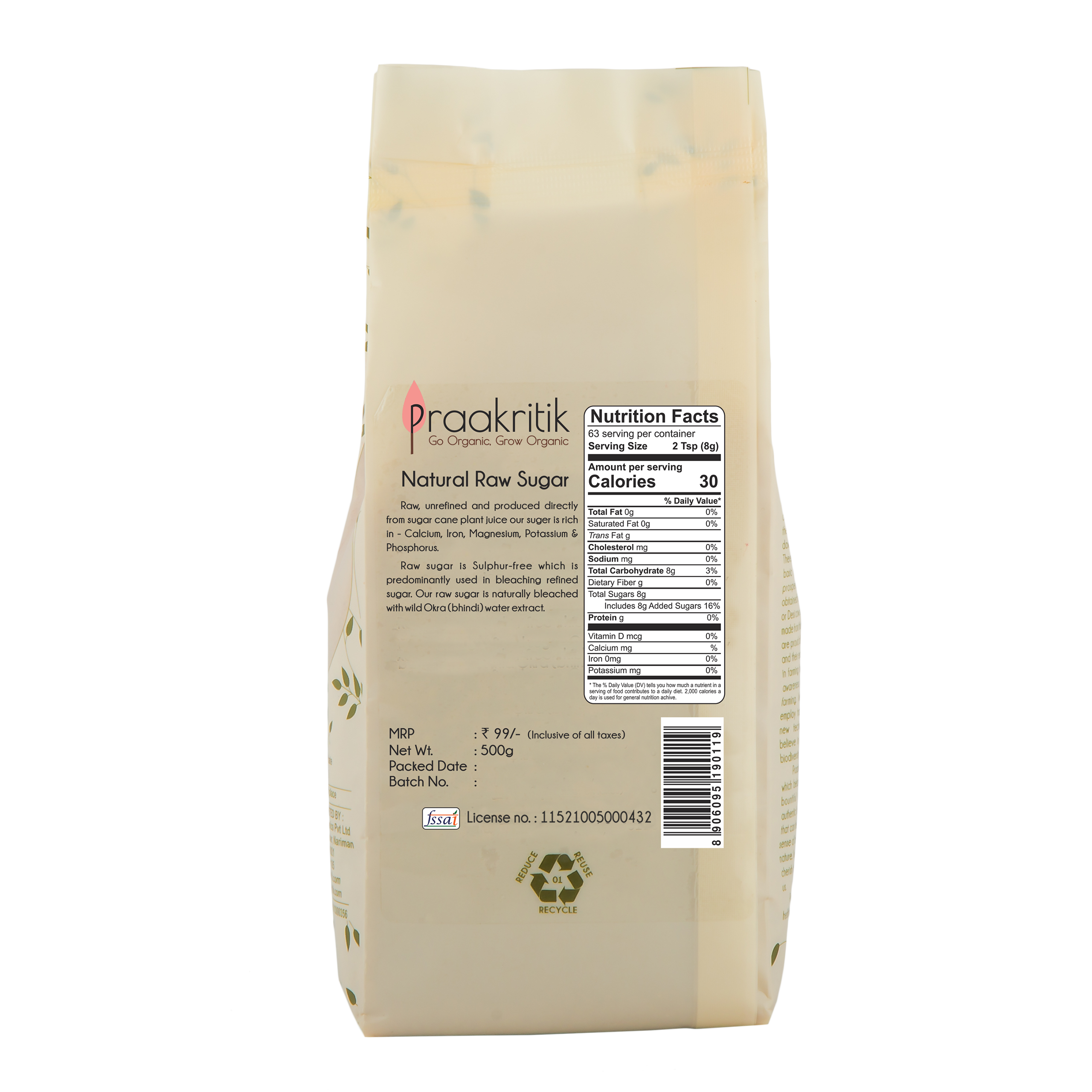 Our Raw Sugar is sourced from sugarcane farmers in the holy city of Haridwar on the banks of the Ganga river. These crystals of pure indulgence are naturally-processed, chemical-free and rich in minerals like calcium, phosphorous, iron and potassium.Our Natural Raw Sugar draws its unique white colour from Okra / Bhindi extracts that are used as a natural bleaching agent.This unique processing and bleaching ensures that these crystals retain their nutrition values and are not just empty calories.Sulphur-free, this sugar is undoubtedly the healthiest replacement for any white sugar available in the market.