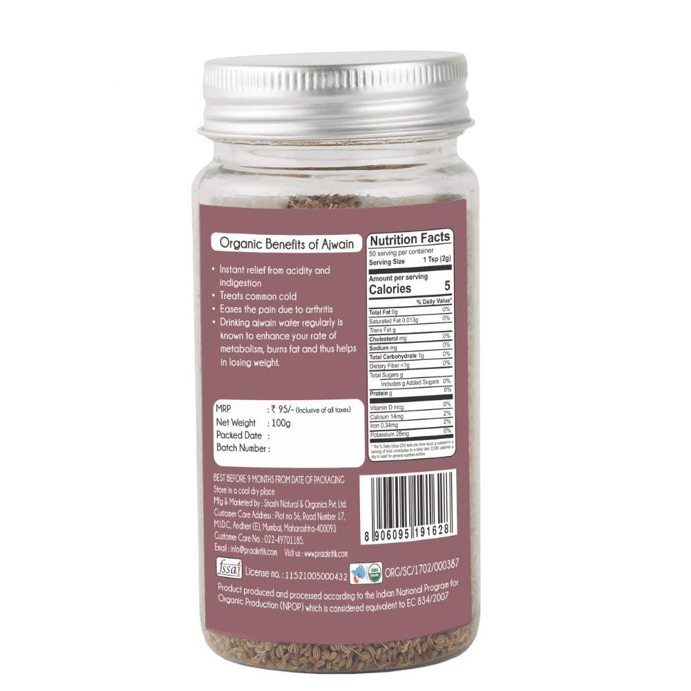 Our Organic Carom Seeds or Ajwain have an oregano like pungent and mildly bitter flavour. They are big on aroma and taste. These tiny khaki-brown seeds are an ayurvedic wonder and are an essential to combat the stress of modern life. Try them to improve skin health and stop premature greying of hair. Our Organic Ajwain or Carom seeds are antioxidant and rich in fibre, vitamins and minerals. They are sourced from certified organic farms in Rajasthan and Gujarat and have anti-fungal and anti-bacterial properties. Ajwain is known to help reduce blood pressure and cholesterol. Ayurveda also uses it as an antibiotic and an anti-inflammatory to help treat arthritis, tooth aches, indigestion, cold etc.