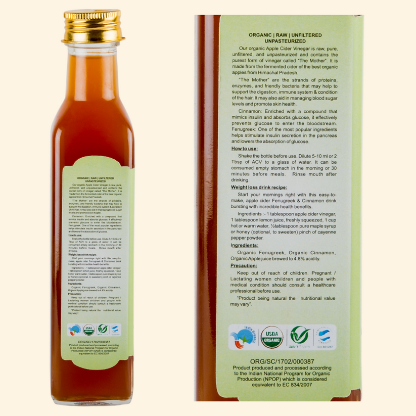 Our organic apple cider vinegar is raw, pure, unfiltered, and unpasteurized form of vinegar. It contains the purest form of vinegar called "The Mother". It is made from the fermented cider of the best organic apples from Himachal Pradesh. "The Mother" contains strands of proteins, enzymes, and friendly bacteria that may help to support the digestive system, immune system and condition of the hair. It may also aid in managing blood sugar levels and promote skin health. Cinnamon is enriched with a compound that mimics insulin and absorbs glucose. It effectively prevents glucose to enter the bloodstream. Fenugreek is one of the most popular ingredients that help stimulate insulin secretion in the pancreas and lowers the absorption of glucose.