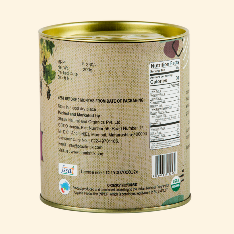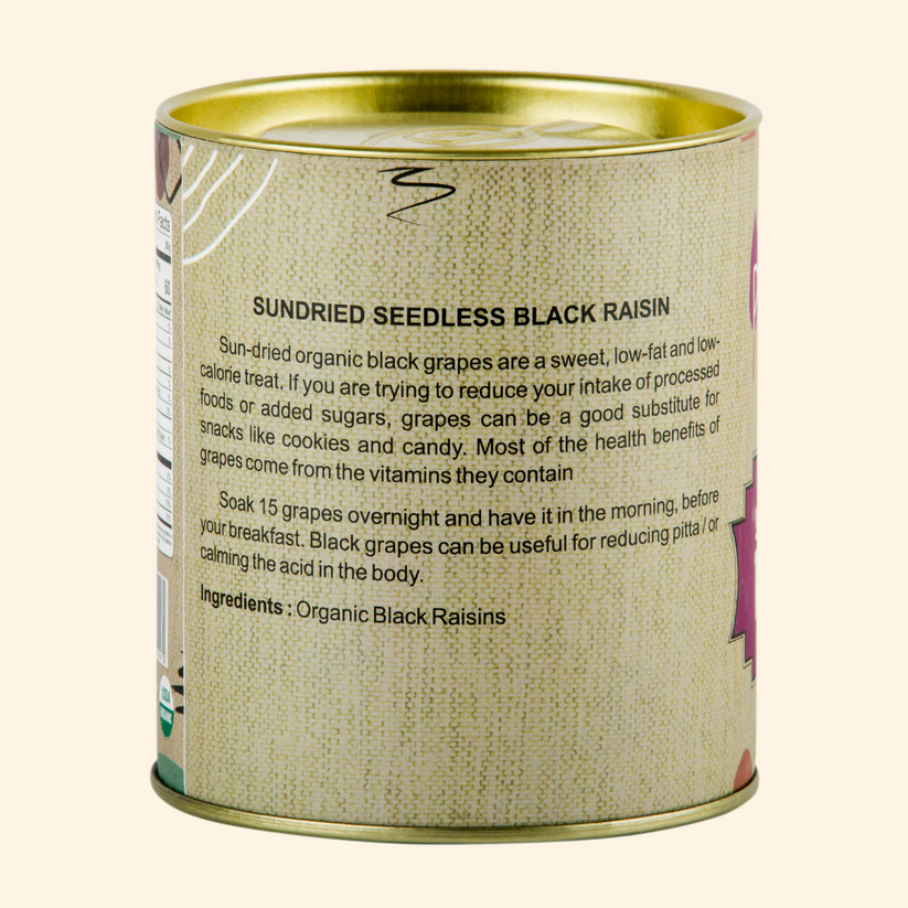 Sun-dried organic black raisins are a sweet, low fat, and low calorie treat.