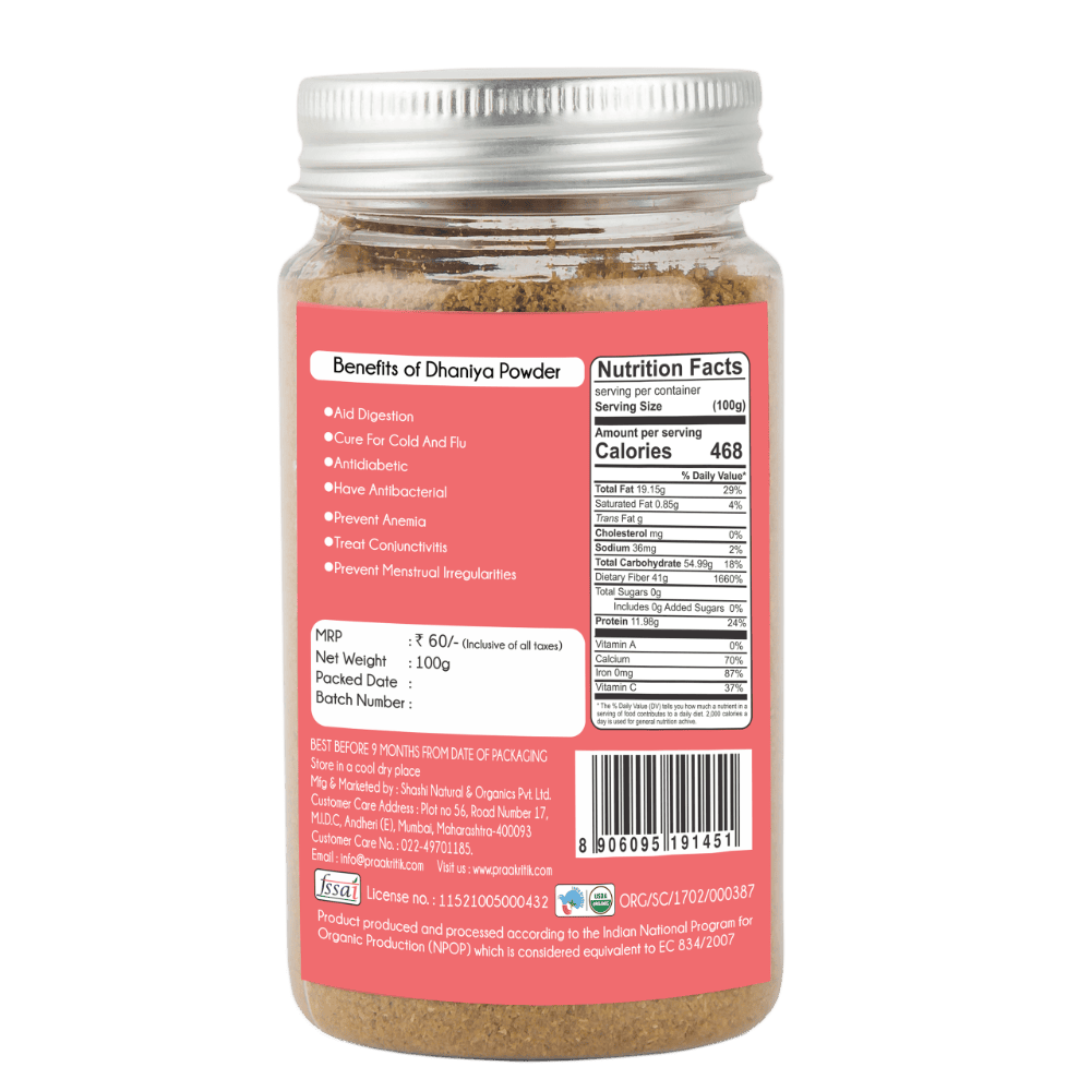 Consumption of Organic Dhaniya powder can Aid Digestion, It is also a Cure for cold and Flu. It has many Antidiabetic & Antibacterial Properties. It helps Prevent Anemia,Treat Conjunctivitis and prevents Menstrual Irregularities.
