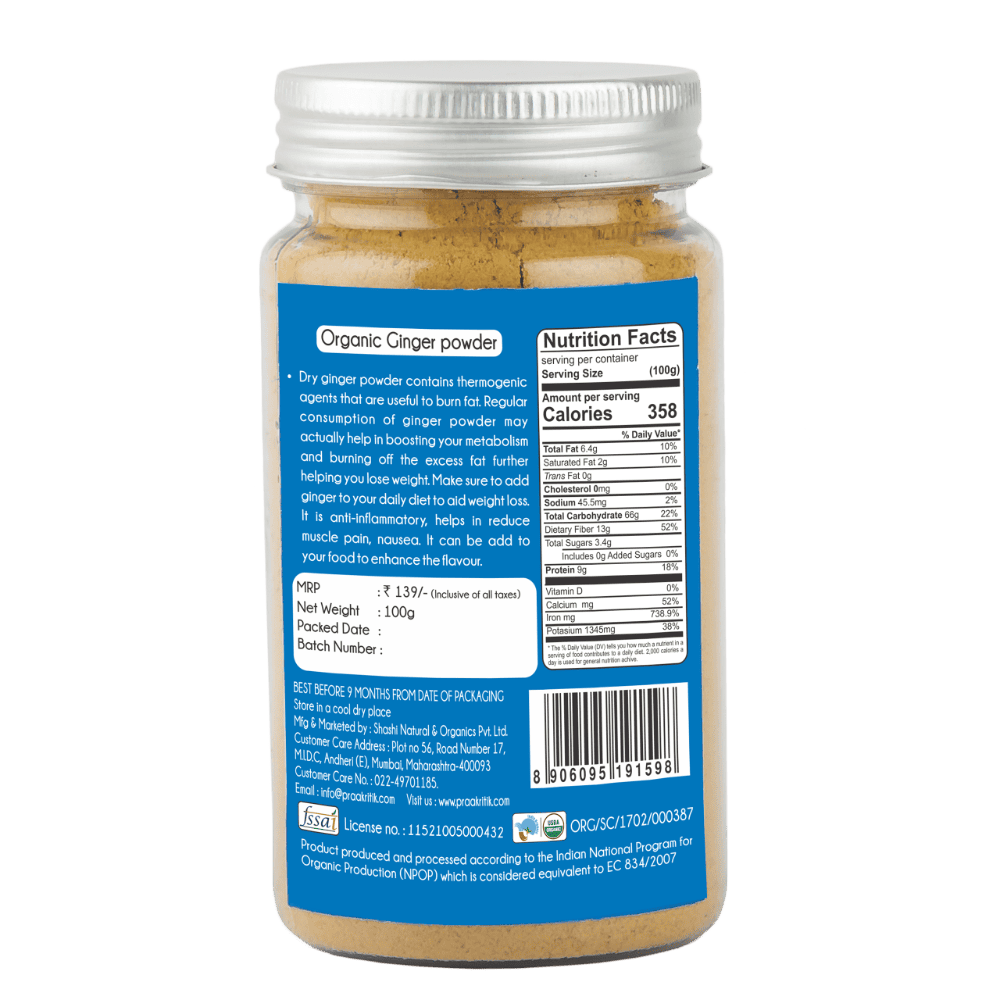 Our Organic Ginger Powder is made from ginger roots sourced from the finest organic farms in North East India. It is pungent and spicy in aroma and has a warm, zesty and sweet bite. Great for beverages, cooking and baking, this powder is also a powerhouse of nutrition. It can also be consumed for weight loss. Our Organic Ginger Powder is a quintessential part of every Indian kitchen and has earned its place as a spice for all occasional known as Sonth, Saunth, Adu, Sukku, Chukku, Soonti or Shunti, this pale yellow powder is a must-have for your overall wellbeing. This powder is loaded with nutrients and bioactive compounds like gingerol that can treat nausea, morning sickness, joint aches, and muscle spasms. It also helps in lowering blood sugar levels, treating chronic indigestion and lowering cholesterol levels.