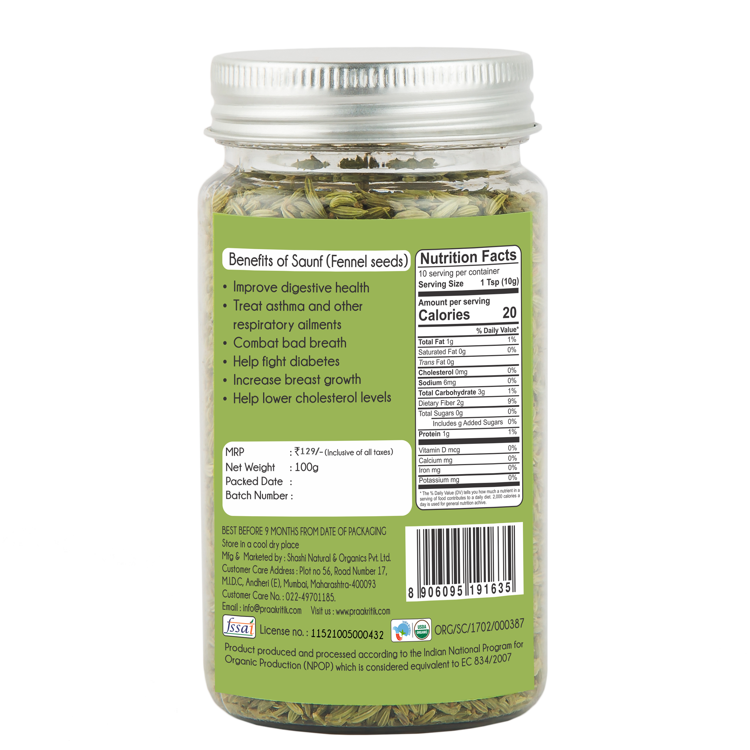Our Organic Saunf or fennel seeds are bursting with a light and sweet anise-like flavour. They are packed with nutrients and are used for seasoning food and in traditional medicines. In India, fennel seeds are a household essential that is also consumed as an after-meal digestive. Sourced from certified organic farms in Rajasthan and Gujarat our Organic Fennel seeds are a good source of copper, potassium, calcium, zinc, manganese, Vitamin C, iron, selenium and magnesium. Saunf helps control blood pressure and flushes out toxins or excess fluids from the body. It also aids indigestion, constipation, IBS, and bloating. Fennel seeds have been used in Ayurveda to reduce all 3 Doshas i.e. Kapha, Pitta and Vata.