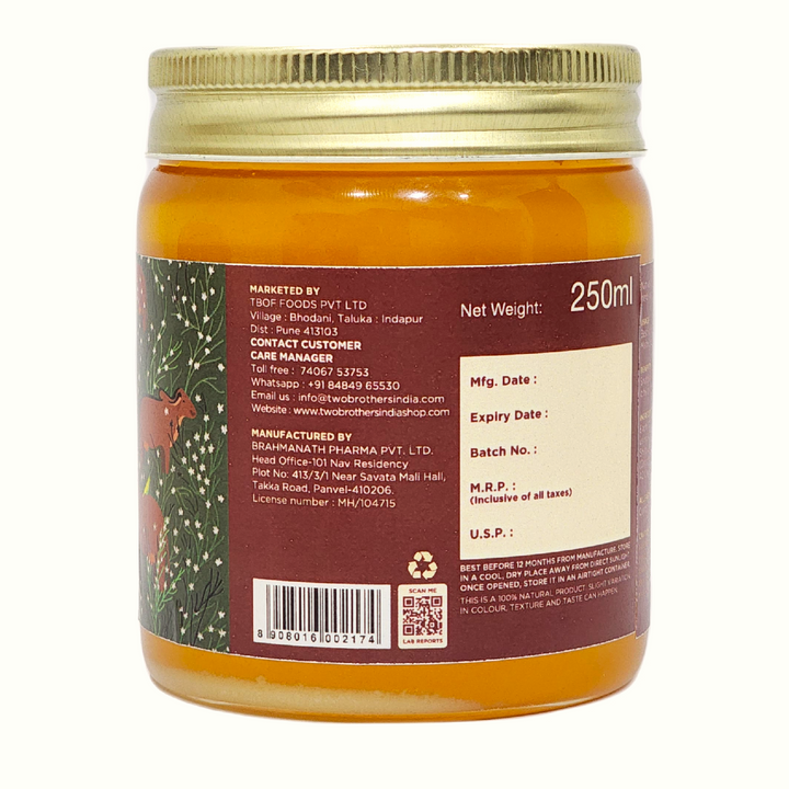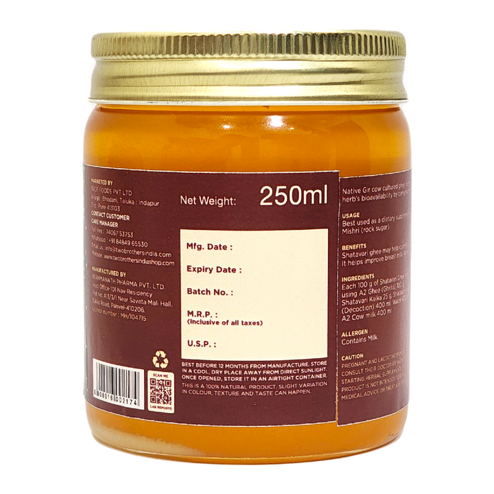 Ghee is clarified butter which is slow cooked over a fire which allows the fat solids to separate. The liquid part is skimmed off and poured into sterile jars. It is infused with Shatavari root extract which acts as an aromatic as well as adds natural antioxidants to the ghee.