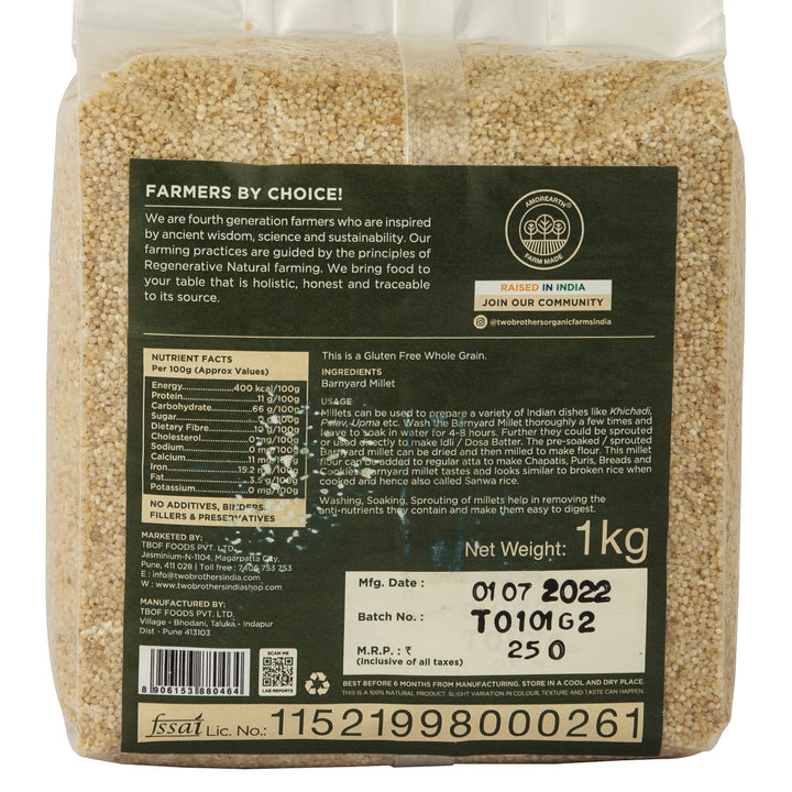 Millets can be used to prepare a variety of Indian dishes like Khichadi, Pulav, Upma etc. Wash the Barnyard Millet thoroughly a few times and leave to soak in water for 4-8 hours. Further they could be sprouted or used directly to make Idli / Dosa Batter. The pre-soaked / sprouted Barnyard millet can be dried and then milled to make flour. This millet flour can be added to regular atta to make Chapatis, Puris, Breads and Cookies. Barnyard millet tastes and looks similar to broken rice when cooked and hence also called Sanwa rice.
