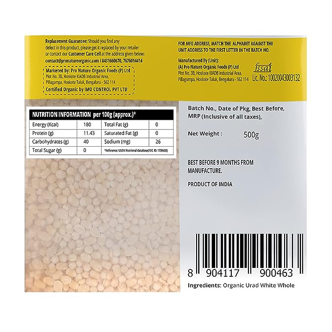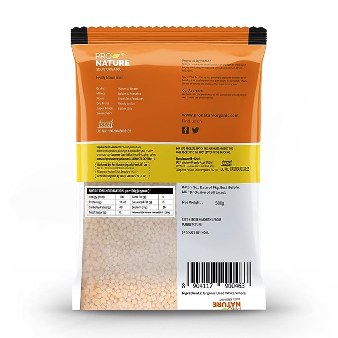 a) Pro Nature Organic Urad White Whole is sourced from certified organic farms bringing 100% organic, unpolished pulses that retain their goodness and natural taste. b) It is an important source of Proteins making it a healthy and tasty meal for everyone. c) Organically grown without pesticides and chemical fertilizers d) Urad White Whole is naturally Gluten Free.