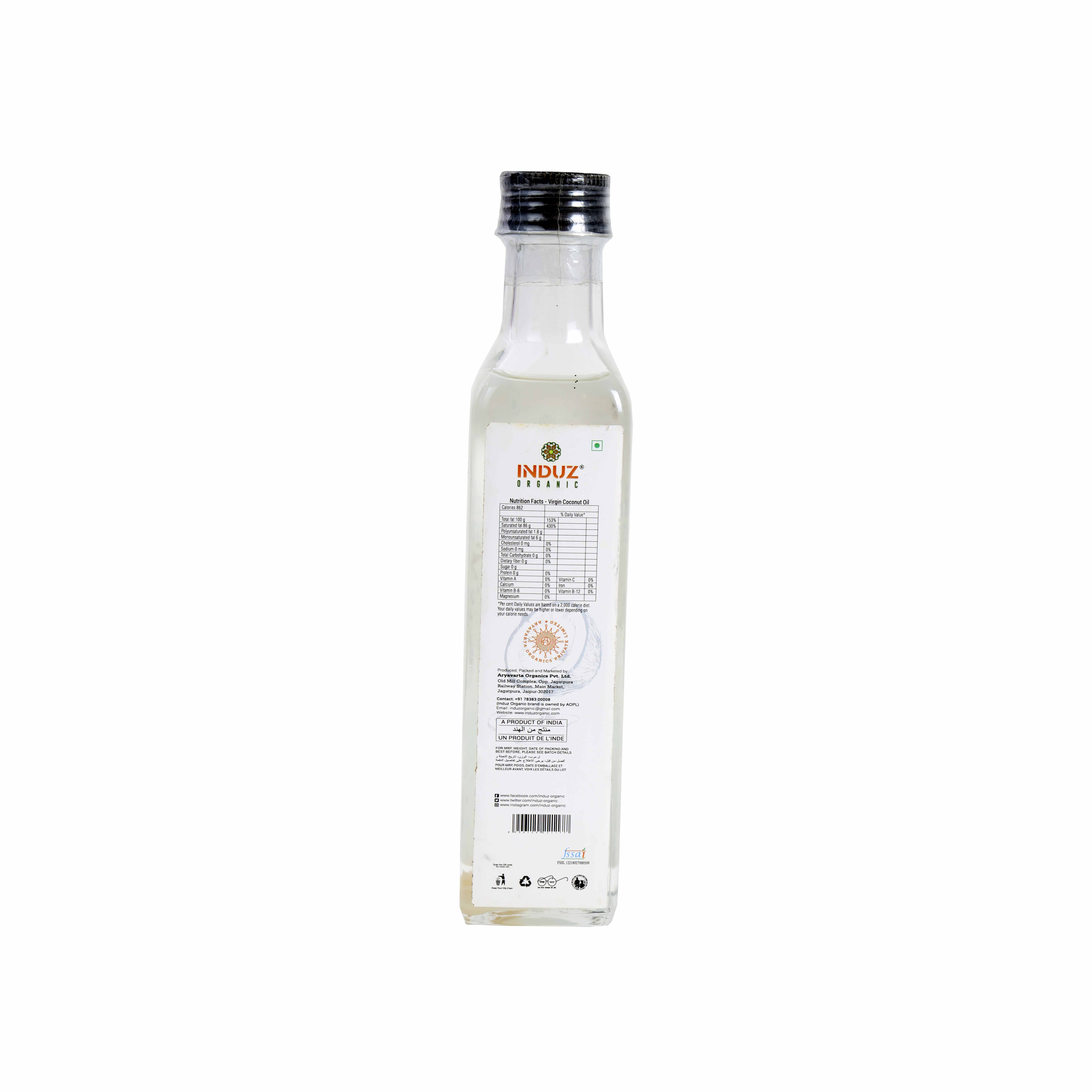 Induz Organic Virgin Coconut Oil -250 ML is obtained from 100% Natural or Organic Coconuts using the traditional cold pressed method. The Induz Organic Virgin Coconut Oil -250 ML is non sticky & fast absorbing to the skin or hair & retains all the nutrients. Benefits : Induz Organic Virgin Coconut Oil -250 ML has anti-viral, anti-bacterial & anti-fungal properties; nourishes & strengthens the hair & scalp; is healthy edible oil for Diabetics. It is one best extra virgin coconut oil for cooking. Induz Organic Virgin Coconut Oil -250 ML helps to burn unnecessary fat & reduce weight.